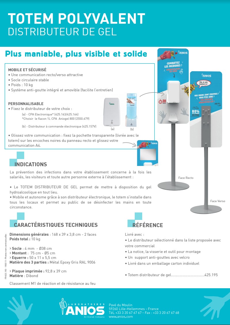 Le TOTEM POLYVALENT DISTRIBUTEUR DE GEL permet de mettre à disposition de tous du gel hydroalcoolique au sein de votre établissement. Il s’installe dans tous les locaux et permet au public de se désinfecter les mains en toute circonstance. Il s'adapte aux distributeurs éléctroniques CPA ou distributeur électronique ABS.